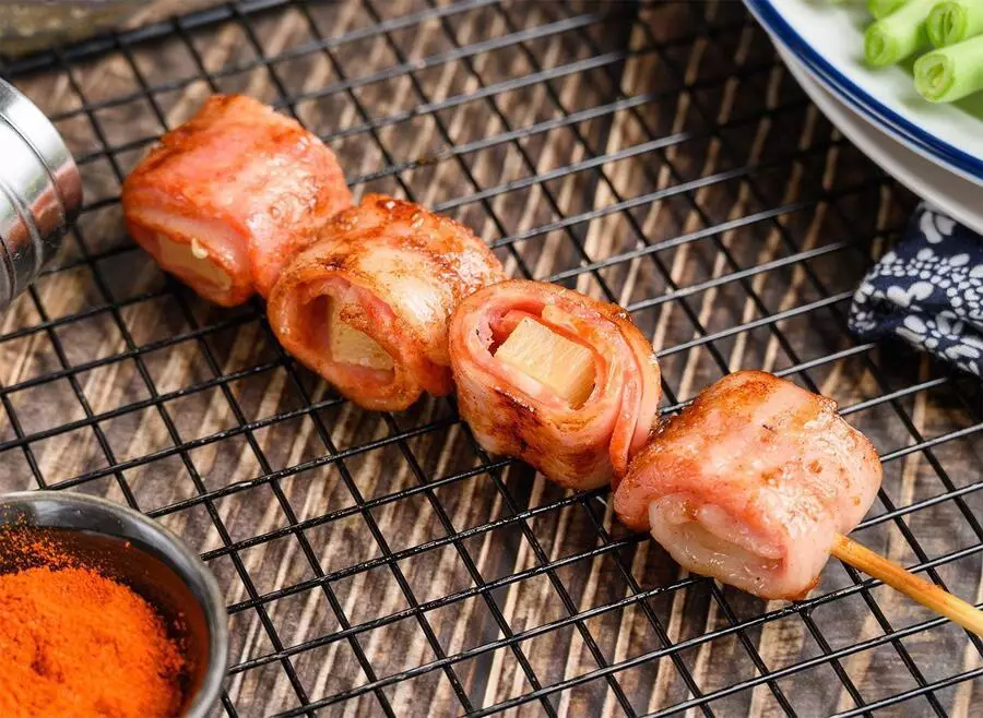 除了經典燒烤,台南美食《獨領瘋燒》也有不少意想不到的創意串燒,像是「培根鳳梨串」——當培根的油脂包覆著微酸的鳳梨,甜鹹交錯的滋味讓人意猶未盡,成為店內的台南隱藏版人氣燒烤。