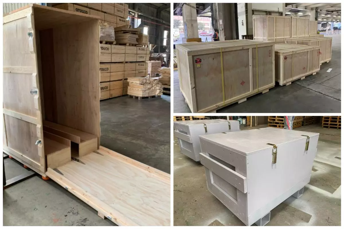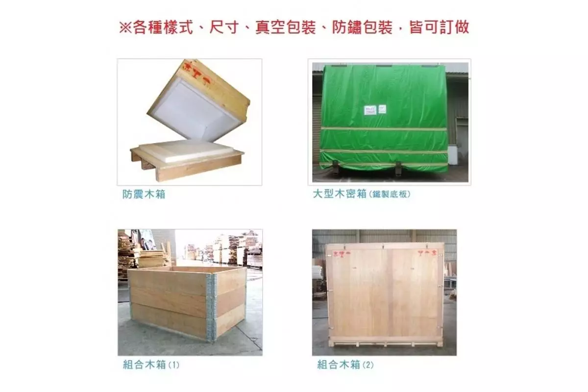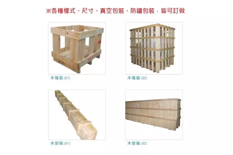 木箱:可訂製各種樣式與尺寸,並提供真空包裝、防鏽包裝等附加服務。