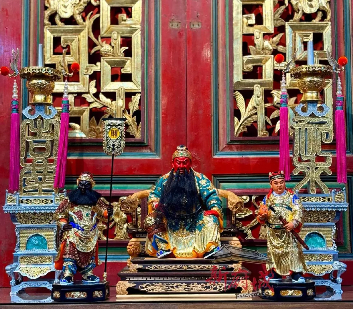 ▲關聖帝君神像組合展示,主神搭配部將與設計錫燈,是信徒供奉常見選擇(圖/Medick Marketing Ltd.提供)