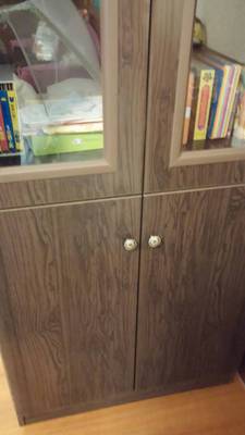 透明書櫃下面就是開門製物櫃喔,塑鋼材質搭上胡桃木色看起來也十分
