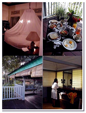 『鴨子花園』的木屋共分六個等級,住宿價格不一且每間構造亦略微不同。有單層平房也有雙層木屋。雖然如此,但各屋的基本設計精神還是類似的,均有濃濃早期殖民地的色彩。說是木屋並不精確,其實更應該說每棟屋子就是小型的木製別墅。沿石板路走向木屋的大門是用練條所鎖住的,推開門後會有木製走廊(已經進入你的屋子了),走廊邊有木製躺椅歡迎著今晚會住宿在這兒的旅客,再往前走會發現陽台及其外迎面的翠綠。陽台上有石雕及木製桌椅,你可以在此享受旅館招待的Welcome drink。木屋內格局分為四處:有長桌及軟臥的客廳(及桌上鮮豔熟透的新鮮水果盤),有白白軟軟床鋪的臥房(及床上天花板垂下有如白紗瀑布的紗帳),有梳洗的內廳 (及水台上透過紙簾照射進來的淺黃柔光) 有最特別的連著私有小花園的浴廁房。浴廁房與花園只以一張短短的竹簾隔著,小花園則是以圍牆作為與屋子外的阻擋。晚上洗澡時若不放下竹簾,甚至可以向上望到閃爍的夜空。你不必擔心會春光外洩,因石牆及私有小花園內的植物(芭蕉等等)會輕而易舉的擋住外面可能的視線。事實上,也不必擔心這點,因屋外全是濃密的叢林,除了小動物外大概也不會有任何的不速之客。此外,屋內的家具是全木製的巴里島風格,大小桌上擺的蠟燭則可以為你的夜裡帶來羅曼蒂克的氣氛。且因木屋位處叢林中,夜晚來臨時各式低吟的蟲鳴是伴你入睡的最佳安眠曲。
