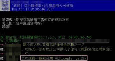 PTT LA版問海運運車回台灣推薦公司,有人推薦Car2TW,除了專業海運搬家海運運車之外,還有完整一條龍服務...