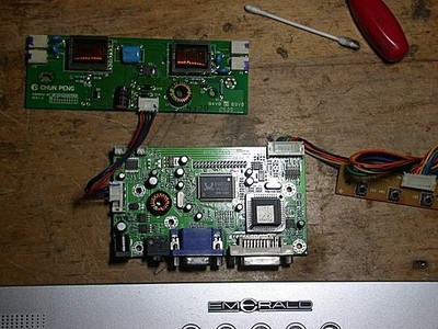 雜牌的.14吋 朋友公司不要的..帶回時~ 已經有維修過 拆過了面板....回家上電..恩恩 ~還有顯示 沒壞.但是很暗...一開機又是先紅色 然後慢慢顏色正常.打開看 .燈管只有一小跟 很細.. ...