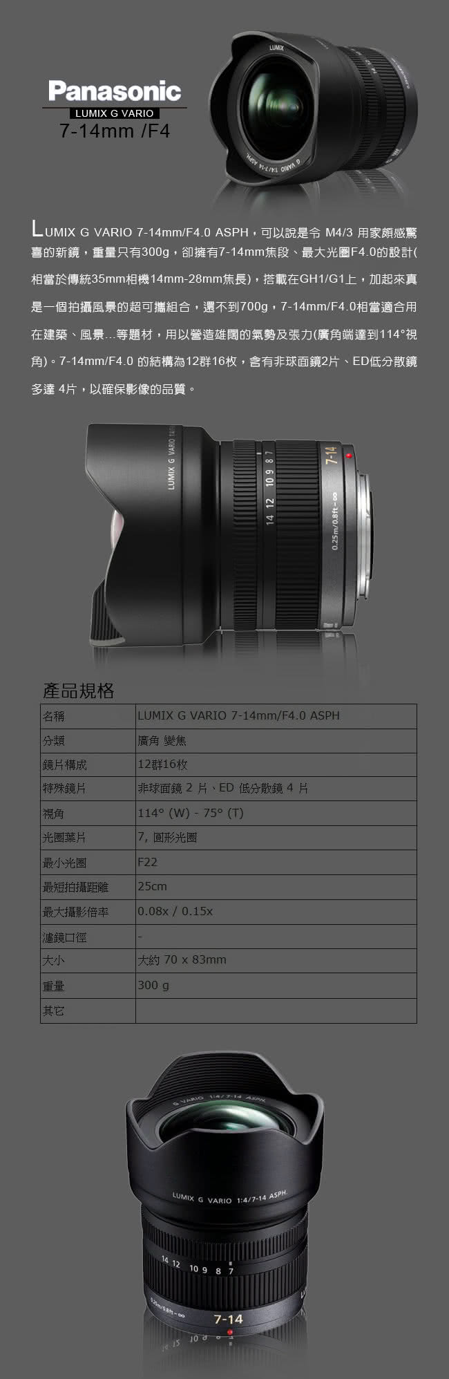 【熱門產品】【Panasonic 國際牌】VARIO 7-14mm F4.0 ASPH. 超廣角變焦鏡(公司貨)-刷卡購買折扣