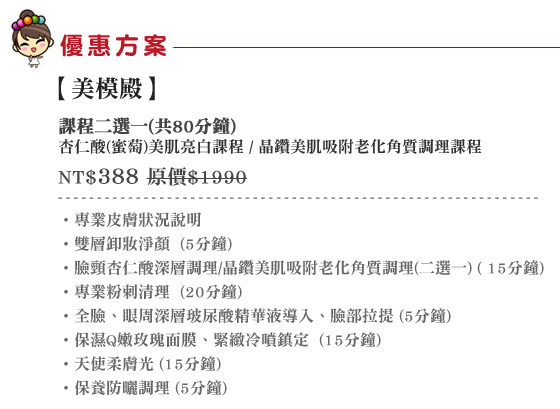 商品訊息簡述: 只要388元即可體驗【美模殿】原價1990元杏仁酸(蜜萄)美肌亮白課程/晶鑽美肌吸附老化角質調理課程 (共80分鐘):專業皮膚狀況說明+雙層卸妝淨顏+臉頸杏仁酸深層調理/晶鑽美肌吸附老化角質調理(2選1)+專業粉剌清理 +全臉、眼周深層玻尿酸精華液導入+臉部拉提+保濕Q嫩玫瑰面膜+緊緻冷噴鎮定+天使柔膚光+保養防曬調理。