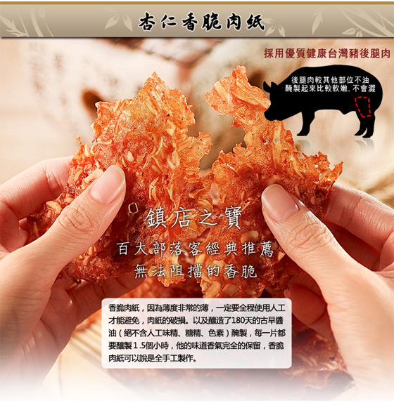 ●獨家研發薄脆肉紙,0.1公分薄度,香酥薄脆,絕對讓人吮指回味