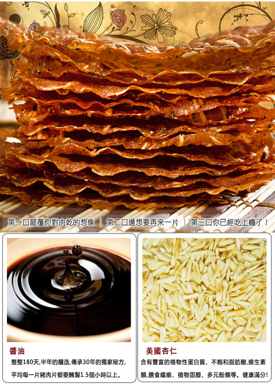 口味:原味杏仁香脆肉紙/泰式檸檬辣味肉乾/招牌特厚黑胡椒豬肉乾/超人氣元氣肉條/招牌特厚蜜汁豬肉乾