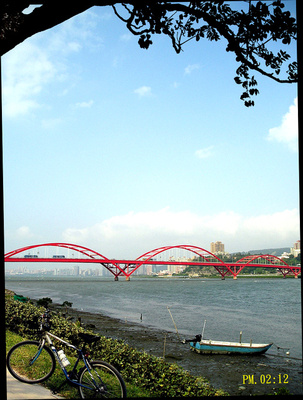 ↑PM.02:18 再來張關渡橋另一邊的到此一騎紀念照,我好像背後長出一對紅翅膀哦~ㄏㄏ!^^騎到關渡橋又迷路了,竟然順著不明顯的引道氣喘吁吁騎上橋上,差點要騎過橋往淡水去,這才從橋上往下看發覺是要穿過橋下啦!金害..害我白白地騎爬坡度很陡的引道,粉累了呢!