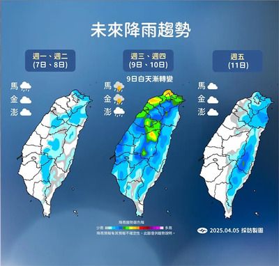 劉沛滕提醒,下週雖然水氣偏多,但留意鋒面通過的時間,雨勢會比較明顯。預計鋒面在下週四、五漸漸通過。下週五可能還是受鋒面水氣影響,北部、東半部局部降雨,但相對天氣最劇烈時間落在下週三晚上至週四,雷雨明顯。