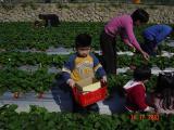 豆花在幾天之前就邀約今天去採草莓,早上會合後一群人就出發了,一路上透過無線電說說笑笑,不一會兒就到達目的地,小朋友一看到草莓園馬上拿著籃子往園中衝,不管他熟了沒先採了再說,飛碟也在旁邊幫著小朋友一下子就採了2小盒,而老婆趁機偷吃了一個沒想到看起來已熟的草莓居然那麼酸,要求不要再採了,於是拿著草莓去老闆處過磅付錢,沒想到2小盒的草莓居然要價550元好貴喔.