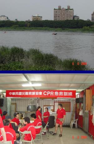 拿完獎狀後有些人就先離開了,剩下的人在那裡聊天,聊著聊著理事長忽然接到了一通110勤務中心打來的電話,說光復橋有人跳水自殺要求我們支援,理事長詢問了大家意見後決定要去,我趕緊聯絡豆花,毛蟹前來,因為從加入到現在是第一次出勤,所以要他們一起來,而毛蟹到時也把麻嗲利一起帶來了,一群人就浩浩蕩蕩拖著橡皮挺和水上摩托車出發,到了現場跟消防局的長官報到了解情形後就趕緊把裝備下水搜尋,但在那裡繞來繞去就是找不到自殺的人,找了約50分鐘後上岸換人,上案休息後忽然有未看熱鬧的老先生走過來跟我說已他的經驗這個人是兇多吉少要我們3天後到新店溪和大漢溪交接口找,但大隊長的意思是消防局沒有下令撤退時要持續搜找到人為止,找著找著消防局下令撤退了,但因退潮的緣故,本來下水的地方已變成爛泥地,船上不來,於是決定換地方上岸,到了上岸處時有人問說是否為防災演習,但跟他說是撈屍體後,他就把一家大小帶著回家了,因為他不敢看.