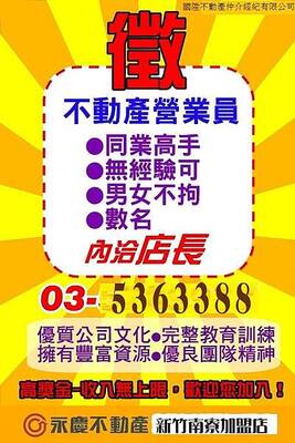 永慶不動產新竹南寮加盟店~誠徵不動產營業員,高獎金,歡迎您加入! ●同業高手 ●無經驗可 ●男女不拘 ●**數名** ★★永慶不動產新竹南寮加盟店成立於民國100年,座落在新竹市北區東大...