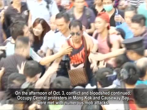 10月3號下午,香港佔中行動發生流血事件和持續衝突,佔中人士在旺角和銅鑼灣遭到大批暴徒暴力襲擊,雙方爆發衝突。據港媒報導,暴徒中包括「愛字頭」、黑社會、內地幫、新界土豪等數千人,堪稱黑社會版「八國聯軍」。