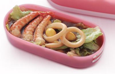 3. 取鍋加少許油,油熱後爆香 蒜片,放入蝦仁、花枝、蘆筍、白果及美生菜片炒香,再加入蠔油、米酒及水1杯,待煮滾後淋入太白粉水芶芡即可起鍋,與白飯一同裝入便當盒。