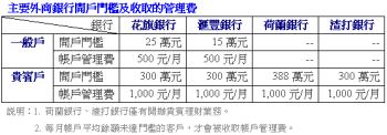每家銀行對於「帳戶月平均餘額」的規定略有不同。以一般戶來說,花旗銀行要求的門檻是25萬元、?豐銀行則為15萬元,荷蘭銀行及渣打銀行沒有提供一般戶的服務;至於貴賓戶,除了荷蘭銀行的門檻在388萬元之外,其餘幾家主要外商銀行都把門檻訂在300萬元。