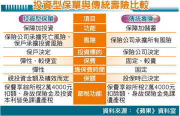 壽險公司表示,投資型保單之所以受到民眾歡迎,除了具有投資及保險兩大功能以外,還有節稅功能,包括每人每年2萬4000元額度的保費免稅扣除額,另外壽險所理賠的死亡保險金,也不計入遺產總額內計算遺產稅。