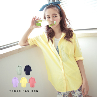 【東京著衣】糖果色素面七分捲袖襯衫(韓系)
