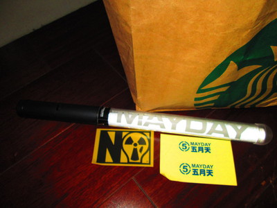 ( 賣米幫忙訂購的官方螢光棒、在場外拿到的反核和五月天貼紙 )今天下午先和螞蟻一起去三多星巴克喝咖啡聊天講講八卦...... 上二樓後就找到了沙發靠窗的位置先放了衣服佔著 點完咖啡上樓 發現位置被坐走...
