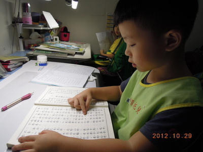 2012/11/28 (三) 雨天"馬麻 你看 我有照你說的把頭抬高喔!"小益今天早上 邊寫教材時 甜甜的跟我...