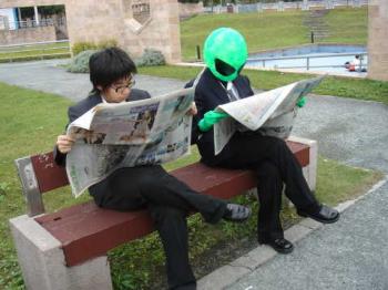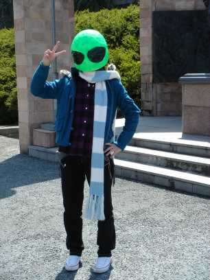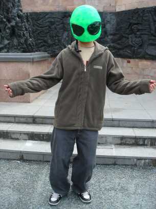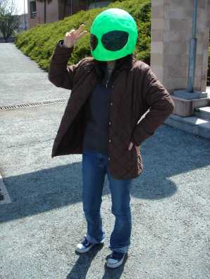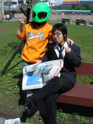 哈哈~有沒有看過大頭小身體的外星人?! 身材比例很不好喔...布丁....哈哈哈 這顆頭大家都輪流戴著玩..真的很搞笑= =