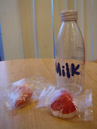 嗯~~這是阿珊喝的Mos milk空瓶!! 瓶子真的超可愛...呼阿 還有那兩顆草莓雪果~一顆是我的.一顆是河馬的 我的那顆草莓跟河馬的比起來超纖細的..明明都是20$ˊˋ ...