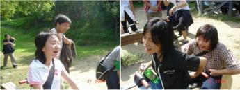 左邊那張是布丁. 右邊那張..黑衣服的是小珊.穿襯衫的是河馬 他們在玩翹翹板..好像是因為"震盪"幅度太強.屁屁會痛...⊙△⊙! 小珊的表情最經典了..真的有那麼痛嗎?哈哈哈 ...