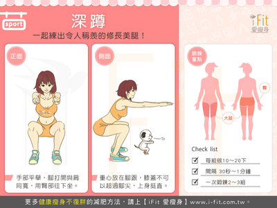 「深蹲」可以一次鍛鍊很多肌群,特別是大腿與臀部的肌肉,可上提臀部的曲線,讓大腿更緊實,最重要的是深蹲不需要任何器具的輔助,隨時隨地都能進行。
