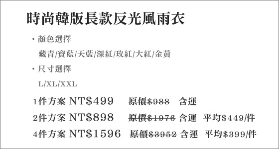 選擇「時尚韓版長款反光風雨衣」,多樣顏色任君挑選!