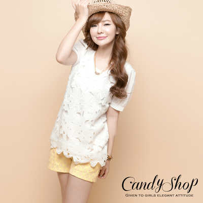 CANDY小舖 前罩蕾絲簍空花片雪紡袖棉上衣(白色)