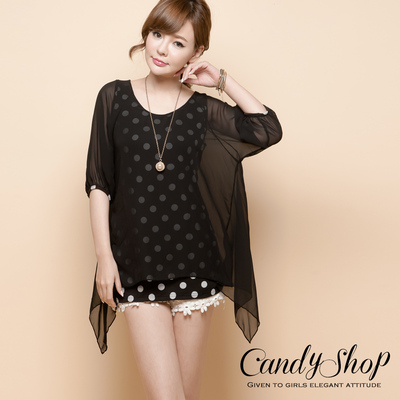 CANDY小舖 內點點外罩雪紡不規則下擺上衣(黑色)