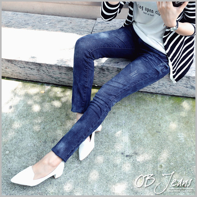 《OB嚴選》0306新品 纖細美體~嚴選韓版個性派水洗紋刷色彈性牛仔褲