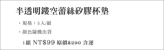 聚餐時刻又到了, 17Life-吃喝玩樂團購3折起,又讓愛聚餐的我們買不停吃不停,價格超殺,如果點進去已經售完別捶心肝喔!限時限量的團購券先搶先贏喔! 宅配只要一個蕾絲杯墊,浪漫氛圍不必遠求!採用安全無毒矽膠材質,充份隔熱,愜意享受屬於你的午茶小確幸!