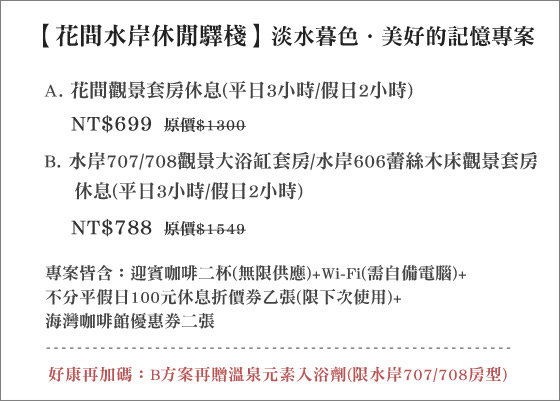 花間水岸提供旅人最貼近風雲際會的渡假休憩閒空間,享受真正淡水河畔的吃、住、玩、樂。淡水旅遊,選擇住宿水岸旁的花間驛棧,感受充分流連淡水夜色中的滋味。