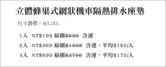 17Life團購網 部落客大推薦~~宅配火燒屁屁的痛苦別等到坐上機車才後悔!3D立體蜂巢式網狀隔熱通風、排水性佳,安裝方便,美觀舒適又耐用!