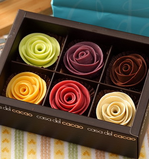 玫瑰花系列,是可可府申請有結構專利的產品,屬於內餡型巧克力(為一般大眾稱之生巧克力),直接使用巧克力甘納許以手製方式,口感極為滑順,由於直接以內餡製成,故在品嘗時風味會直接在口中散發開來,且入口即化的特點使得此系列商品廣受客人喜愛。冷藏口感像牛奶糖,Q軟中帶濃濃果香,冷凍如冰淇淋,口感綿密香濃入口即化。送情人、朋友、家人都非常適合。目前可可府共研發了12種口味,六入禮盒隨機挑選六種口味,恕無法指定口味。((目前提供的盒型為藍色+咖啡色緞帶款))