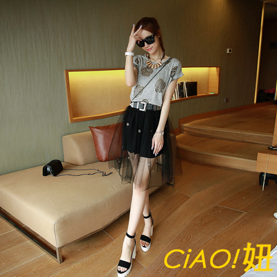 皮帶扣裝飾拼蓬蓬網紗短裙 (黑色)-CiAO妞