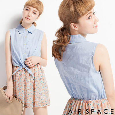 AIR SPACE 丹寧無袖襯衫拼接雪紡花裙洋裝(甜美粉)