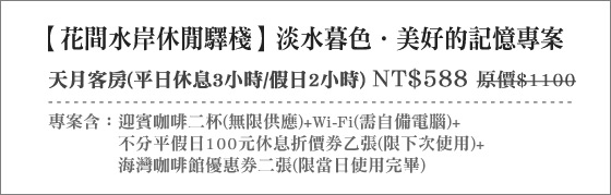 花間水岸提供旅人最貼近風雲際會的渡假休憩閒空間,享受真正淡水河畔的吃、住、玩、樂。淡水旅遊,選擇住宿水岸旁的花間驛棧,感受充分流連淡水夜色中的滋味。