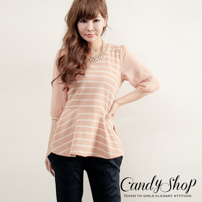 CANDY小舖 女孩特性橫條傘狀雪紡袖棉上衣(粉橘)