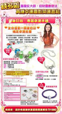 2014歲末將近,但仍然動盪不安,大自然的反撲災難、人性貪婪引發的災難、人與人之間的鬥爭、?滅良心的詭異犯罪頻頻傳出,薇薇安老師結合20多年的命理經驗,搭配有靈動力的招財靈數密法,設計了錢多啦彩鑽幸運靈數套組!同時搭配飾品的流行風潮,讓你可以自由組合變換戴出多種幸運風格。