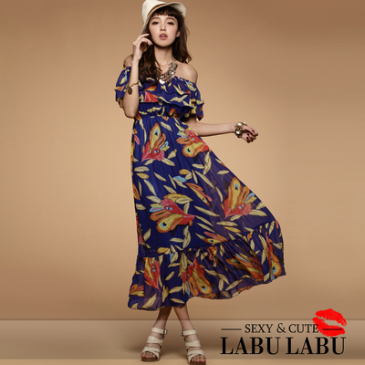 LABU LABU 一字羽毛印花彈性縮腰雪紡洋裝(優雅藍)