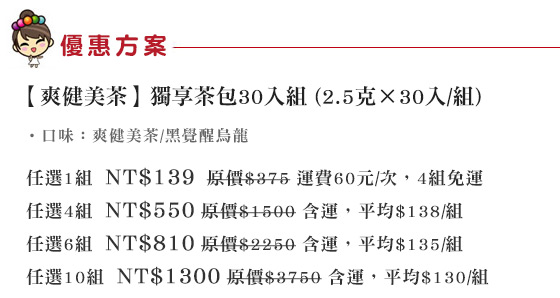 聚餐時刻又到了, 17Life-吃喝玩樂團購3折起,又讓愛聚餐的我們買不停吃不停,價格超殺,如果點進去已經售完別捶心肝喔!限時限量的團購券先搶先贏喔! 宅配超夯爽健美茶全新口味-黑覺醒茶包,熱情回歸!只用一半的價格,就能享受相同成份的輕便茶包!冷熱皆可!