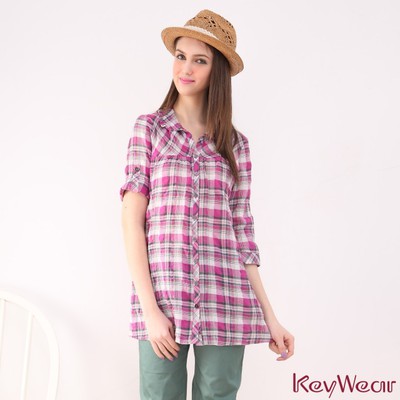 【KeyWear奇威名品】清新格紋舒適長版上衣