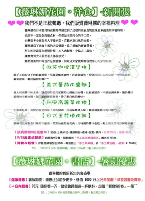 來到龜山的薇琳娜花園,映入眼簾的是門口露台,有著可愛塗鴉的三片黑板上,寫著書店、洋食、婚禮...