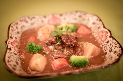 燉了牛肉了...用奶油把裹著麵粉的牛肉煎的焦香...可以在這個時候淋上一些紅酒...然後隨著熱氣...留下果香...