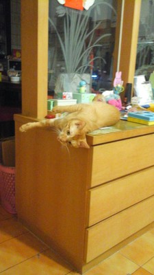 有保護色的波波在櫃子上舒服的滾來滾去眼睛有點流眼淚的掛在小黑板上<媽媽,妳什麼時候要餵我?>結紮完的波好像温和...