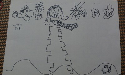 女兒畫划龍舟龍舟好多人划可是還是魚遊的快喔!魚說:傳說中的粽子呢?