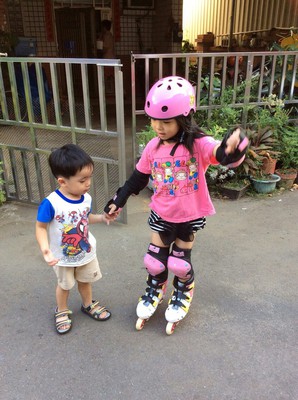 聽姊姊說要到外面溜直排輪弟弟急急忙忙的鞋子穿錯腳跑到外面說:『姊姊,我來牽妳』真是窩心耶!難怪人家說對女生最好...