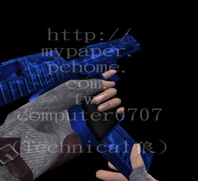 我把CSO黃金夜鷹的圖轉成CSO雙持夜鷹的貼圖在變成藍色,最後在把手持的地方修成黑色,但是...花不到我10分鐘 ^_^ (遊客突然一拳...我飛走了 = =)只可惜...這把只有V檔 = =,因為是...