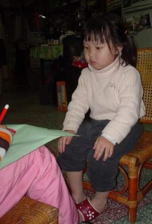 咪咪正在速寫家萱,萱萱正襟危坐的擺POSE,咪咪認真的畫,畫得還真好。